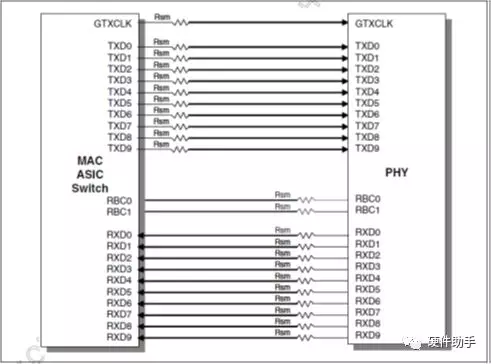 RTBI接口数据位宽为5bit,时钟频率为125MHz,在时钟的上升沿和下降沿都采样数据,同RGMII接口一样,TX_EN线上会传送TX_EN和TX_ER两种信息,在时钟的上升沿传TX_EN,下降沿传TX_ER;RX_DV线上传送RX_DV和RX_ER两种信息,在RX_CLK上升沿传RX_DV,下降沿传RX_ER。