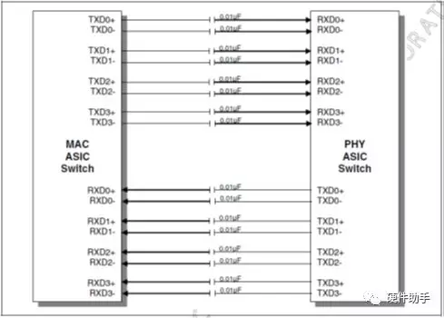 XAUI接口采用差分线,收发各四对,CML逻辑,AC耦合方式,耦合电容在10nF~100nF之间。