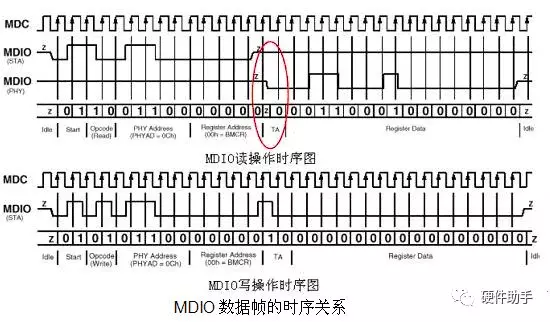 TA:状态转换域,若为读操作,则第一比特时MDIO为高阻态,第二比特时由物理层芯片使MDIO置“0”。若为写操作,则MDIO仍由MAC层芯片控制,其连续输出“10”两个比特。