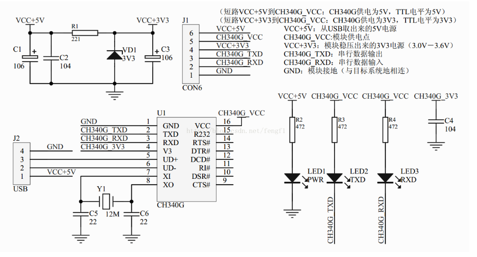 图为某宝CH340模块原理图,该模块较为简单,主要需要注意的地方有: