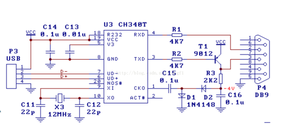 CH340是南京沁恒公司生产的USB转串口芯片,能够将TTL电平转换为USB的输出。常见的USB转换串口的芯片有PL2303,CH340等,CH340因性价比较好,良品率较PL2302好,所以应用的更为广泛。常见的电路图有如下: