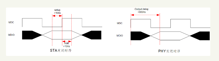 协议对MDIO接口时序进行了定义。如图2所示,以MDC上升沿为基准。当MDIO由STA输出时,需要满足建立时间、保持时间均大于10ns。当MDIO由PHY输出时,需要满足输出延迟不超过300ns。
