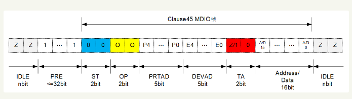 PRE:Preamble,前导。每帧发送前,STA通过MDIO连续发送32个MDC周期的高电平,同时通过MDC输出32个时钟周期。前导的作用是为PHY建立同步提供时间。如果STA能够确定PHY可以接收管理帧,可以压缩前导的发送。