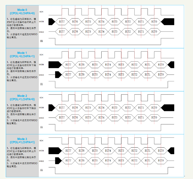 如图2所示,SPI根据时钟极性(CPOL),采样相位(CPHA)的不同分为四种工作模式。CPOL代表SCK空闲时电平极性,为0时表示空闲时SCK为低电平,为1时表示空闲时SCK为高电平。CPHA代表采样相位,为0时使用SCK单个周期中第一个时钟沿采样,为1时使用SCK单个周期中第二个时钟沿采样。