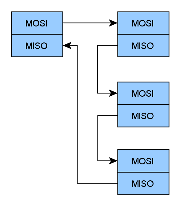 主MOSI连次级MOSI,次级MISO连次次级的MOSI....,然后由最后一级的MISO再送回到主设备的MISO。