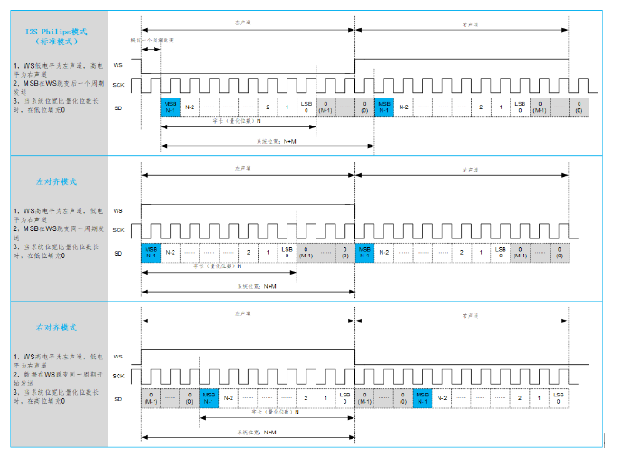 右对齐模式:高电平表示左声道且无效数据填充在高位,数据在WS跳变当周期开始发送