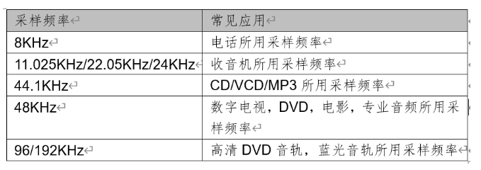 常用采样频率如表2所示,表中对不同的应用需求,采样频率做了不同的定义。理论上讲,采样频率越高音质越好,而实际上按照刚好够用的原则,8KHz(》3.4KHz*2)用于语音业务已够用, 44.1/48KHz(》20KHz*2)用于音频已够用。