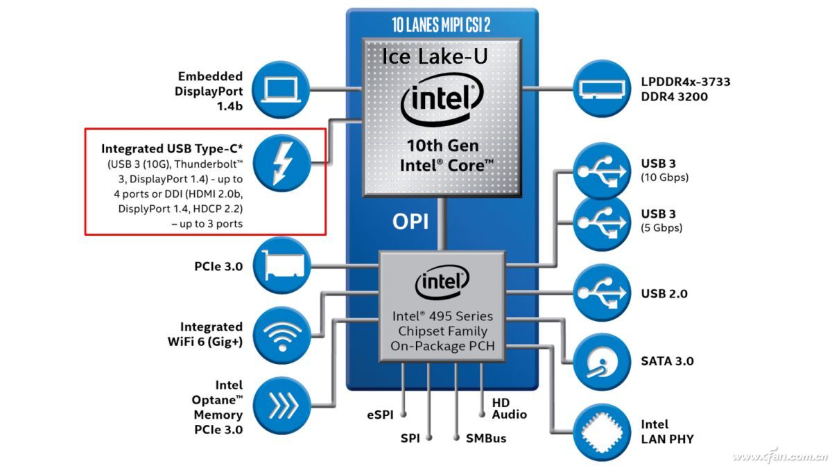 我们都知道,第10代酷睿包含10nm Ice Lake(轻薄本)和14nm Comet Lake(轻薄本和游戏本)两大平台。从底层架构来说,Ice Lake将雷电3控制器整合进了CPU内核中,而且原生就支持4个雷电3,其PCI-E 3.0通道数量高达32条。虽然这些通道中有16条(4×4)是仅供雷电3专属使用,但却再也不会占用CPU提供的PCI-E总线数量或者是与PCH一起抢夺原本就已拥挤不堪的总线资源。