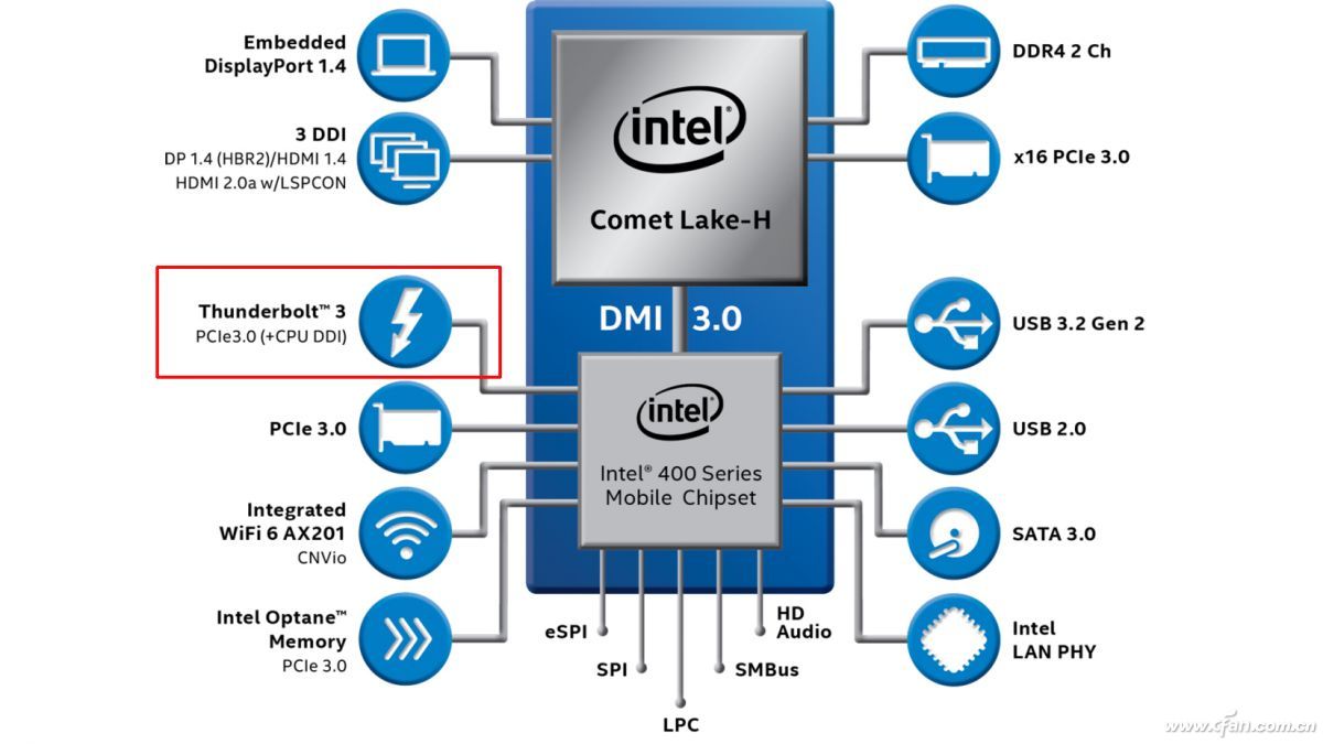 如果说Ice Lake平台的雷电3功能是以“CPU(集成雷电主控)→Retimer→接口”路径实现,那Comet Lake平台就是“CPU→DMI→PCH→雷电主控→接口”,步骤更多,成本、性能和功耗损失也就更大。