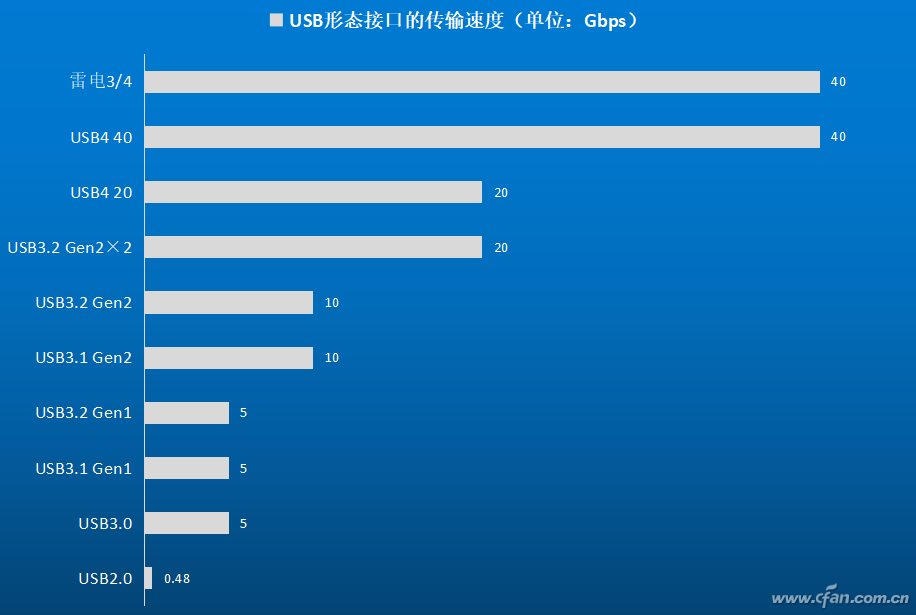 USB4存在20Gbps传输速率的“半速版”,用来取代现有的USB3.2 Gen2×2标准,同时,USB4还有更高速的USB 40,我们可以将其理解为雷电3的简化版。