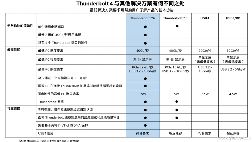 而雷电4,则可视为“全功能满血USB4”,不仅需要拥有40Gbps的满速,还需同时兼容USB PD充电和原雷电3的全部功能,在视频输出能力(支持双4K显示器)、配套线缆和安全等方面的认证要求更高。