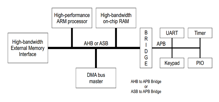 ASB是AHB的替代方案,不需要某些高性能功能。APB是一种简化的接口,专为不需要AHB或ASB的高性能的低带宽外设而设计。其中包括UART,低频GPIO和定时器等组件。
