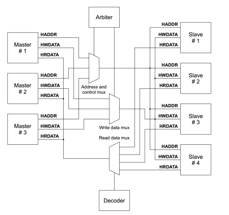 图2.带有主设备,从设备,多路复用器,仲裁器和解码器的AHB(AMBARev.2.0)