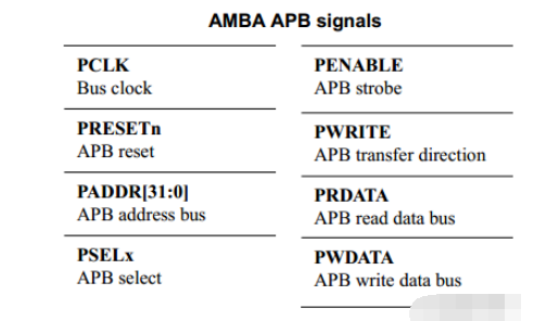 高级外设总线(APB,AdvancedPeripheralBus)由一个称为APB桥的单总线主站组成,它充当AHB/ASB上的从站。因此,桥接器是高性能总线和低频外围设备之间的接口。APB上的外围设备是从属设备。图4列出了APB信号名称。