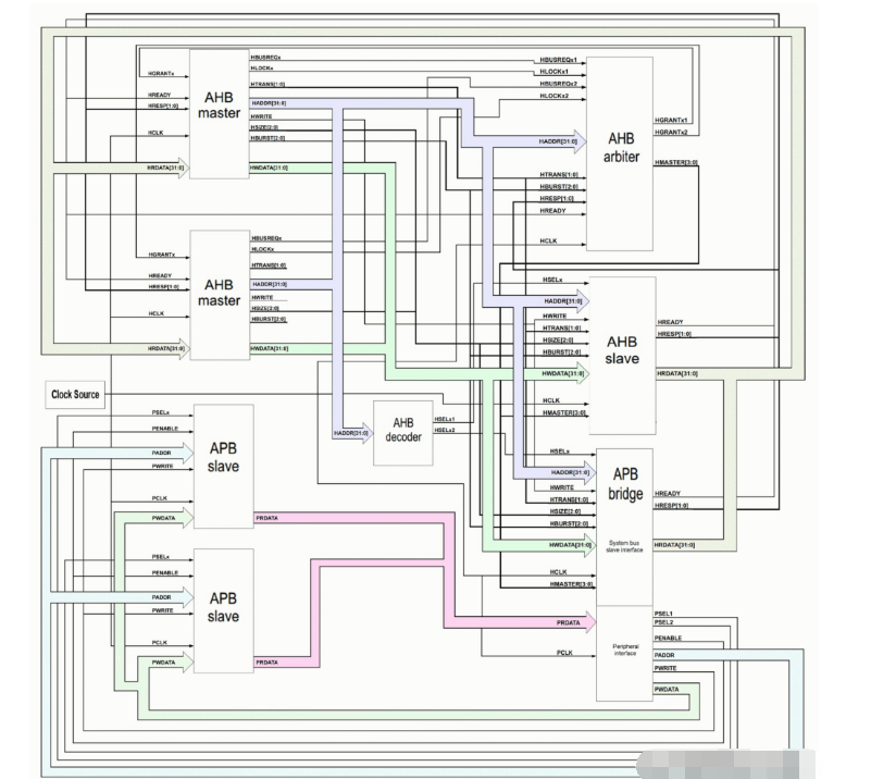 APB桥接器具有AHB从接口,因此它看起来像是主站的另一个从站。该系统已被简化,一些信号和次要元件(如复位信号和多路复用器)被移除。输出信号离开块的右侧,输入信号进入块的左侧。输入信号也用箭头表示。较粗的线表示较大的数据路径。