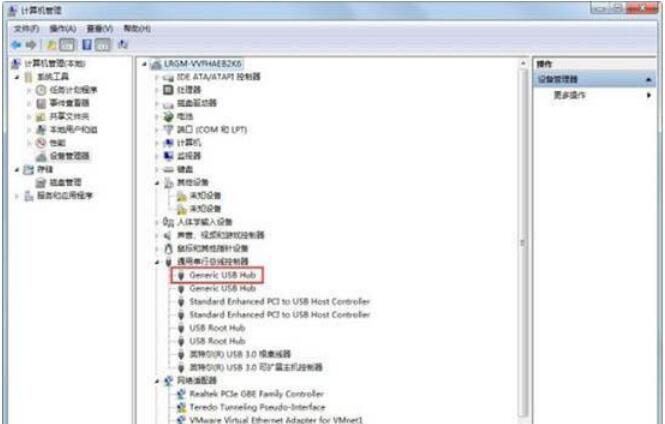 2、待进入设备管理器之后,在设备管理器里面找到“通用串行总线控制器”,点击前面的倒三角符号,打开里面支选项,双击任意一个“USB Root Hub”,即可进入“USB Root Hub属性”页面;如图所示: