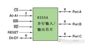 如下图所示的Intel8255A是一种典型的并行输入/输出芯片。它有24根输入/输出信号线,在IBMPC/AT中,曾作为连接键盘、开关、喇叭等的接口。