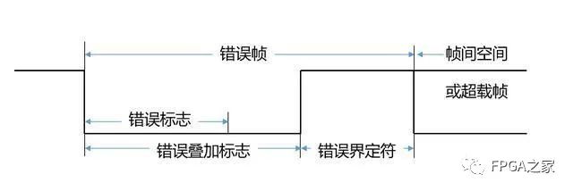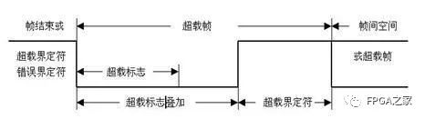 如果CAN节点在错误界定符或过载界定符的第8位(最后一位)采样到一个显性位,节点会发送一个过载帧。该帧不是错误帧,错误计数器不会增加。