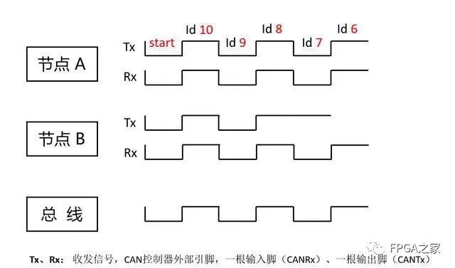 如图所示,节点 A 和节点B 的标识符的第10、9、8 位电平相同,因此两个节点侦听到的信息和它们发出的信息相同。第7位节点B发出一个“1”,但从节点上接收到的消息却是“0”。