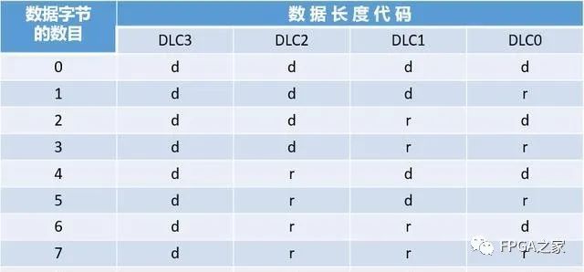 数据长度代码指示了数据场里的字节数量。其中:d—“显性”, r—“隐性”,数据帧允许的数据字节数为{0,1,...,7,8}。其他的数值不允许使用。