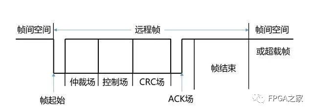 与数据帧类似,远程帧也有标准格式和扩展格式,而且都由6个不同的位场组成:帧起始、仲裁场、控制场、CRC场、应答场、帧结尾。