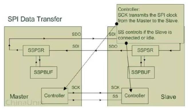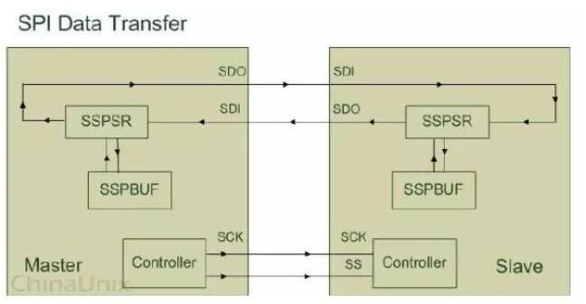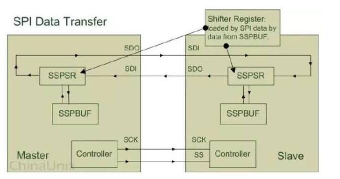 SPI设备在进行通信的过程中,Master设备和Slave设备之间会产生一个数据链路回环(DataLoop),就像上图所画的那样,通过SDO和SDI管脚,SSPSR控制数据移入移出SSPBUF,Controller确定SPI总线的通信模式,SCK传输时钟信号。