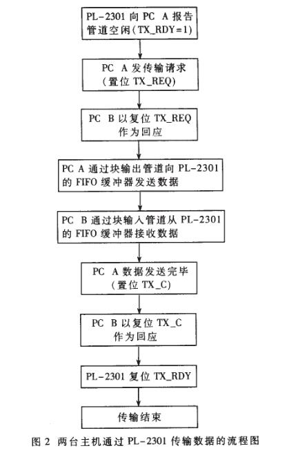 在这几个握手信号的协调下,上位机和下位机可以双向通信。图2是主机PCA向PCB传输数据的流程图。这些底层的细节问题并不需要控制,由PL-2301的驱动程序完成。