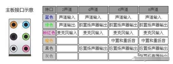 绝大部分主板一般只会设置右边三个接口,少部分主流以及高端型号主板会给你带齐完整的5-6个,每一个接口的颜色不同,代表的功能也不同。绿色孔对于主流的音响而言几乎是必接接口,这个就是常规的声道输出,可以满足各种常规1.0声道音响,2.0/2.1的发生需求。