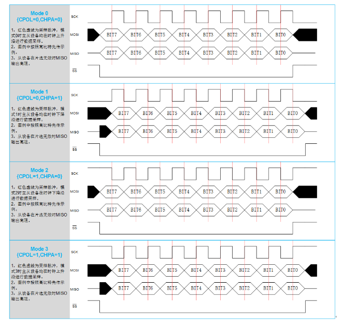 如图2所示,SPI根据时钟极性(CPOL),采样相位(CPHA)的不同分为四种工作模式。CPOL代表SCK空闲时电平极性,为0时表示空闲时SCK为低电平,为1时表示空闲时SCK为高电平。CPHA代表采样相位,为0时使用SCK单个周期中第一个时钟沿采样,为1时使用SCK单个周期中第二个时钟沿采样。