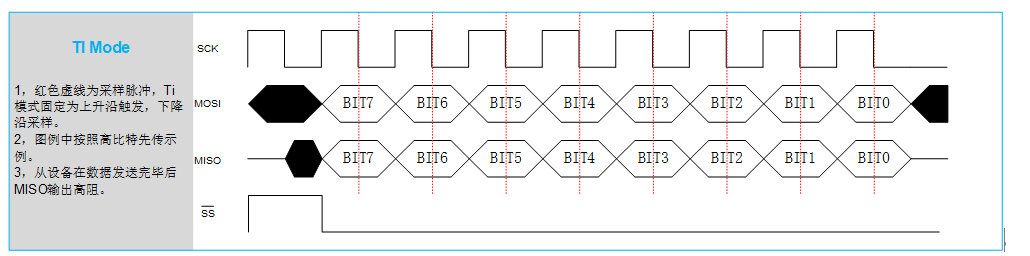 一般地SPI控制器支持Motorola模式和TI模式两种模式。TI模式SPI又称为SSI,其和Motorola模式的区别主要在片选信号的区别。Motorola模式在有效数据传输时片选一直为低有效,而TI模式仅在第一bit数据传输前一个周期有效,用于表示数据开始传输,其他周期均为低电平。TI模式时钟极性和采样是固定的。具体时序如图3所示。