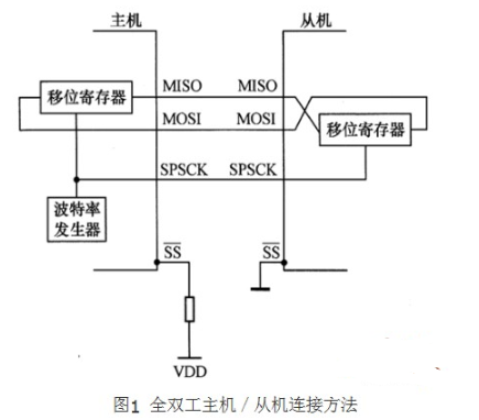 下图是由一个主机对接一个从机进行全双工通信的系统构成的方式.在该系统中,由于主机和从机的角色是固定不变的,并且只有一个从机,因此,可以将主机的SS端接高电平,将从机的SS端固定接地.