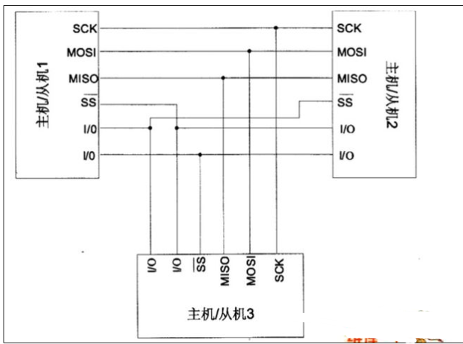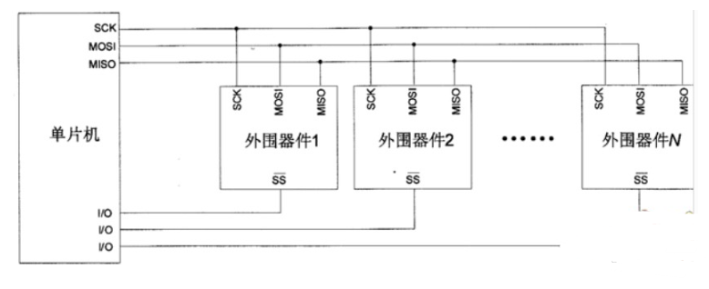 下图是一个主机和多个从器件的通信系统.各个从器件是单片机的外围扩展芯片,它们的片选端SS分别独占单片机的一条通用I/O引脚,由单片机分时选通它们建立通信.这样省去了单片机在通信线路上发送地址码的麻烦,但是占用了单片机的引脚资源.当外设器件只有一个时,可以不必选通而直接将SS端接地即可.