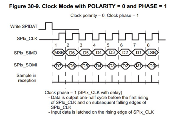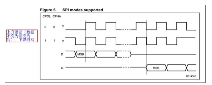 时钟极性和相位都是1时,上升沿为后沿,数据稳定被采样(锁存),下降沿为前沿,被写入SPI总线.