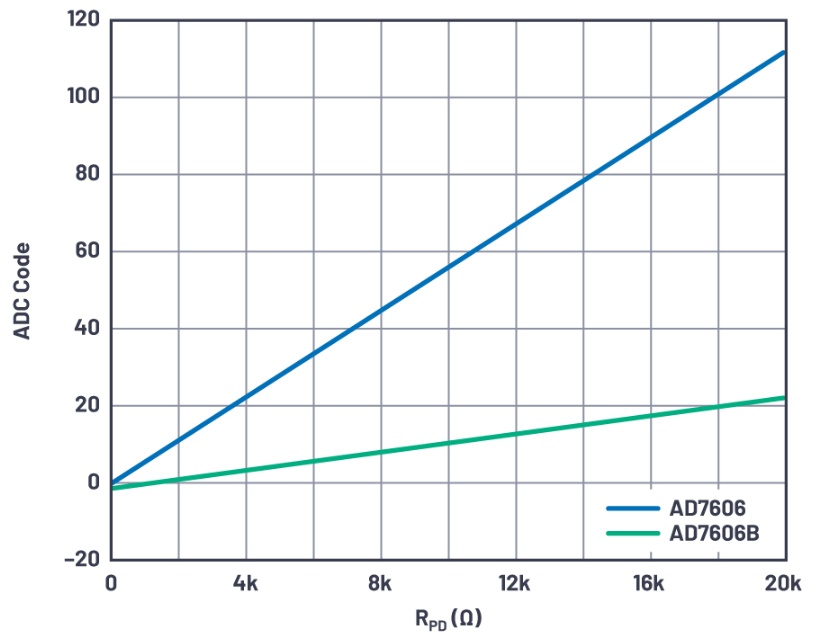 建议采用比传感器的源阻抗大得多的RPD,将该并联电阻可能产生的误差减至最小。但是,RPD越大,在传感器断开时生成的ADC输出代码也越大,这并非我们期望的结果。由于AD7606B的RIN比AD7606大,对于给定的RPD,如果传感器断开,ADC输出代码会降低(如图3所示),从而降低了误报的风险。
