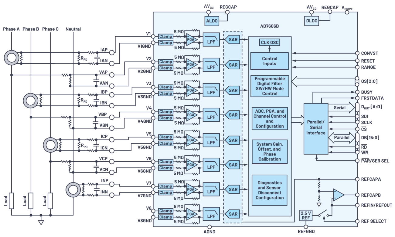AD7606B为市场带来了完整的芯片数据采集系统。可实现所有的模拟前端内建模块。它提供了一套完整的高级诊断功能,以及增益、偏移和相位校准。因此,AD7606B降低了组件成本和系统 设计的复杂性,从而简化了电力线监控应用设计。