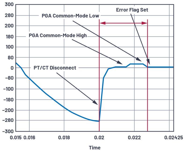 传统上,将下拉电阻(RPD)与传感器(图1中所示的电流互感器)并联,用户可通过监测多个样本(N)的ADC输出代码是否重复小于20 LSBs,来检测传感器何时断开。