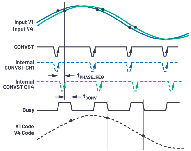 CONVST引脚用于管理模数转换启动,以便同时在所有通道上触发该流程。但是,对于通过电流互感器(CT)测量电流同时通过分压电阻按比例缩小来测量电压的应用,存在电流和电压通道之间相位不匹配的情况。为了补偿这种不匹配,AD7606B可以延迟任何通道(相对延迟大一点儿的通道)上的采样时刻,以便将输出信号调整到同相,如图5所示。