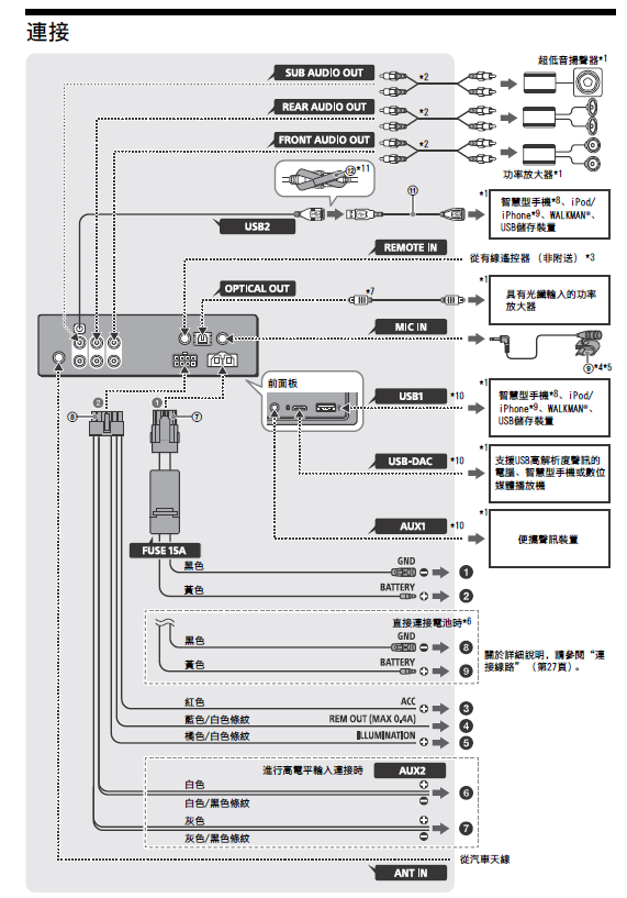 1.ANTIN.接口,接汽车收音机天线。由于RSX-GS9支持车载收音机功能,所以保留了收音天线的接口。