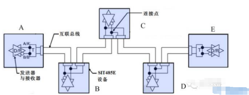 其布线方式就是主控设备与多个从控设备形成手拉手连接方式,如图1所示,即:假如整个RS485总线上有A、B、C、D、E多个设备,则布线为:将A的485+接到B的485+接口上,再从B的485+上面再引出一条线接到C的485+上面,以此类推,一直接到E的485+接口上面,485-接线方式和485+一样。特别注意的是,不留分支才是手拉手的方式。