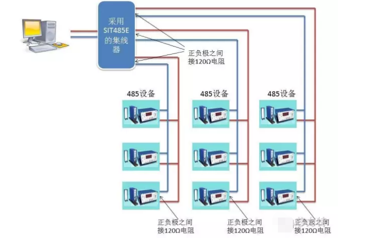 采用星形结构的RS485总线拓扑如图3所示,这种结构要注意在集线器的每一对458+,485-端口加120Ω的终端匹配电阻。