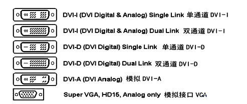 这个接口有DVI-A、DVI-D和DVI-I三种不同的接口形式,其中,DVI-D只有数字接口,DVI-I有数字和模拟接口。 DVI-D接口是真正意义上的数字信号接口,其中还分为单通道和双通道两种,即接口为18针或者24针。其中24针的接口可以传输更多数据,最高支持1080p分辨率的3D画面显示。