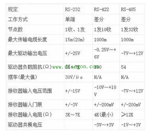 (1)RS-232、RS-422与RS-485的性能参数表: