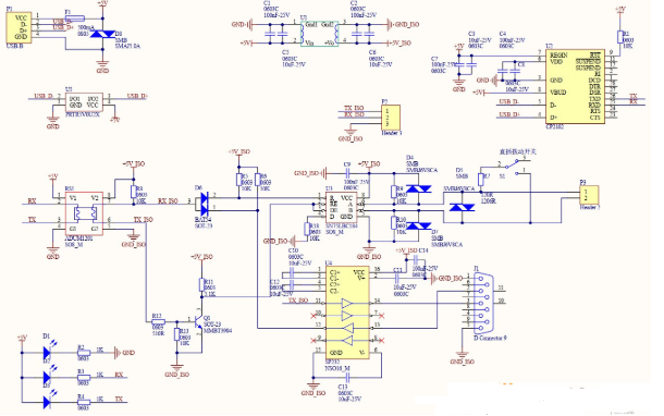 实现USB转485、232、TLL转换器,电路中采用电源隔离与信号隔离。在USB转RS485,USB转RS232,USB转TTL电路中,涉及到的重要芯片包括:ADUM1201、CP2102、PRTR5V0U2X、SN75LBC184等。