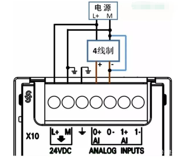 四线制信号是提供信号的设备上信号线和电源线加起来有4根线。提供信号的设备有单独的供电电源,除了两个电源线还有两个信号线。四线制信号的接线方式如下图所示: