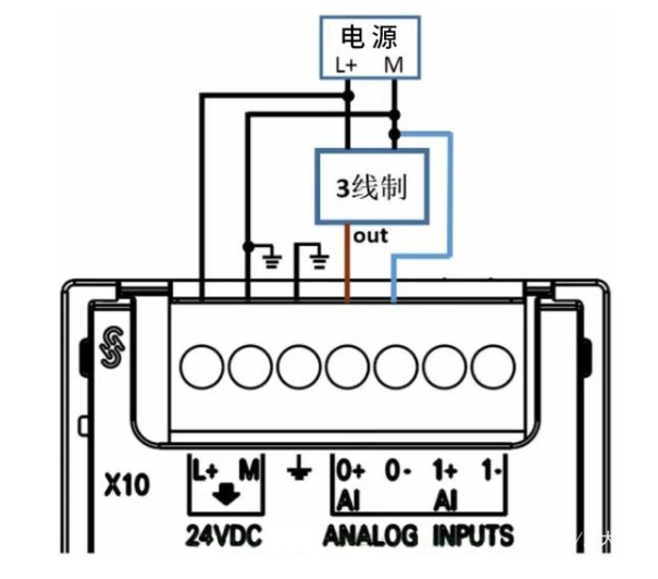 三线制信号是指提供信号的设备上,信号线和电源线加起来有3根线,信号负与供电电源M线为公共线。三线制信号的接线方式如下图所示: