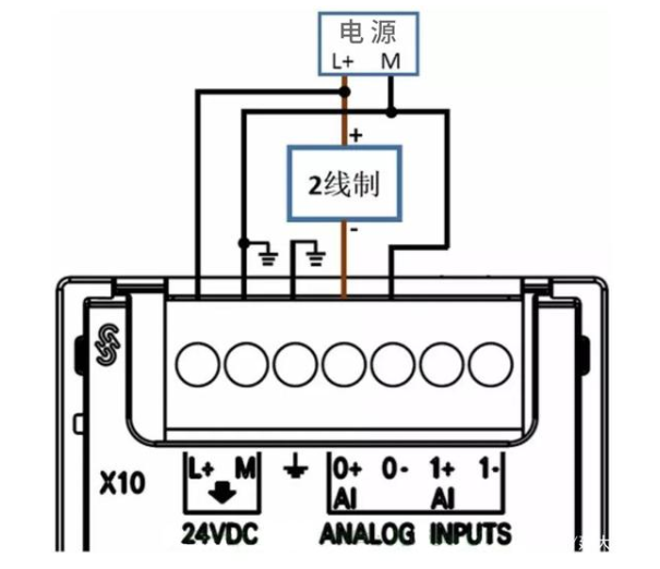 两线制信号指提供信号的设备上,信号线和电源线加起来只有2根线。由于模拟量模块通道一般没有供电功能,所以温湿度传感器仪表或设备需要外接24V直流电源。两线制信号的接线方式如下图所示: