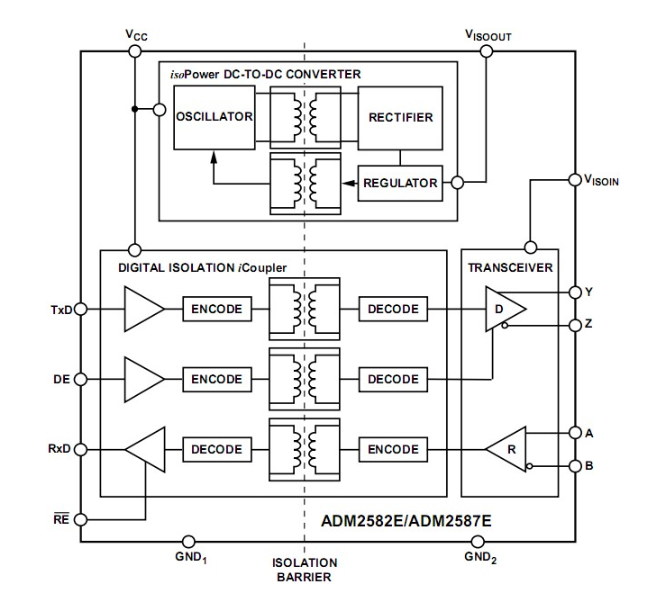 根据ADM2582E/ADM2587E的功能框图,我们可以看出其内部含有isoPower技术,具有反馈控制的高频开关稳压电路。 对于TxD、RxD、DE和RE均采用iCoupler磁隔离技术对其数字信号进行隔离。此外,还包含一个能够实现半/全双工的RS-485/RS- 422收发器。以单芯片实现了能适应各种需求的RS-485/RS-422接口隔离方案,其芯片封装仅为SOIC-20。