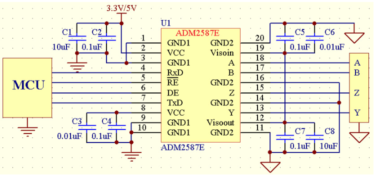 ADM2587E的全双工隔离电路与半双工隔离电路类似,其后端的A、B、Y、Z直接与全双工总线相连即可。