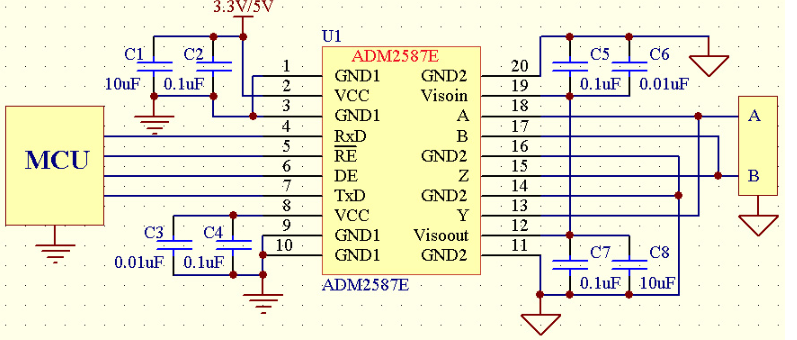ADM2582E/ADM2587E均可采用3.3V或5V供电,能够方便的与普通5V供电系统和低功耗的3.3V供电系统连接。A、 B、Y、Z引脚上带有±15KV的ESD保护及25KV/us的共模抑制能力,能够为芯片引脚提供大部分的保护功能,在恶劣的应用环境中,可以在总线上添 加TVS管等器件以增强芯片对大的浪涌电流、电压的防护能力。