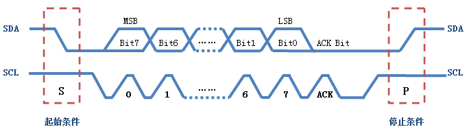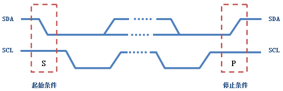 I2C协议规定,总线上数据的传输必须以一个起始信号作为开始条件,以一个结束信号作为传输的停止条件。起始和结束信号总是由主设备产生。总线在空闲状态 时,SCL和SDA都保持着高电平,当SCL为高电平而SDA由高到低的跳变,表示产生一个起始条件;当SCL为高而SDA由低到高的跳变,表示产生一个 停止条件。在起始条件产生后,总线处于忙状态,由本次数据传输的主从设备独占,其他I2C器件无法访问总线;而在停止条件产生后,本次数据传输的主从设备 将释放总线,总线再次处于空闲状态。如图所示:
